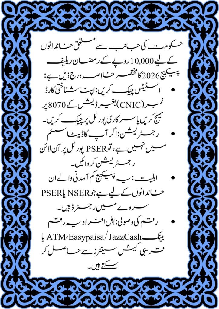 | Ramzan Relief Package 2026 | Rs.10,000 cash assistance for eligible families | Government of Pakistan / Punjab Govt |